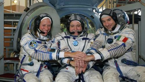 俄宇航员尤尔奇金(中)、美国航天局宇航员凯伦·耐伯格(左)和欧洲航天局航天员卢卡·帕尔米塔诺。