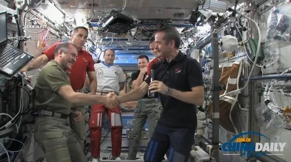 哈德费尔德(右)离开之前和留守宇航员握手。