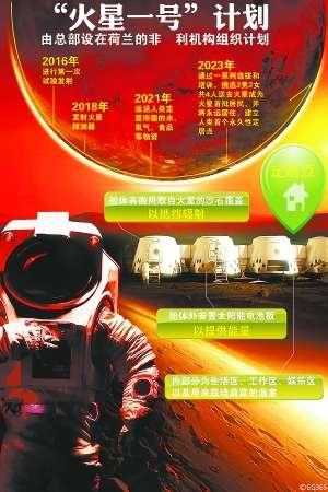 “火星一号”计划是由一家荷兰私人公司主导的火星探测计划,目的是在火星建立人类永久殖民地。预计于2023年派遣首批4名志愿者前往火星,他们将作为火星永久定居点的先锋,此后每隔两年运送更多人前往火星。