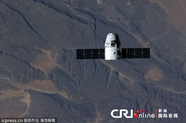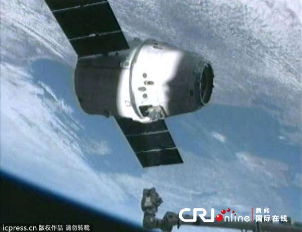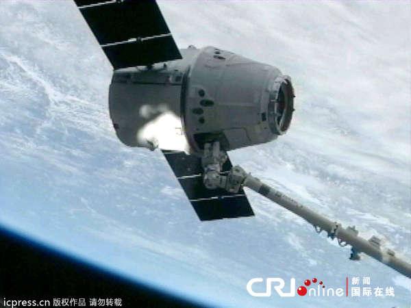 当地时间2013年3月3日,专家在地面成功实现远程控制,利用机械臂将“龙”号商用货运飞船与国际空间站对接。图片来源:Chris Hadfield/东方IC