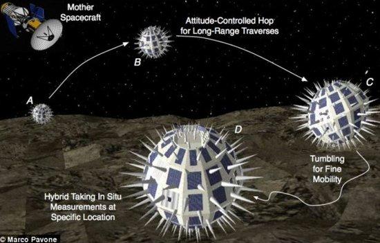 据国外媒体报道,美国宇航局与斯坦福大学的研究人员目前正讨论派遣“火星车”前往火卫一进行探索的计划,该火星车具有非常特别的造型,酷似小型“机器刺猬”,科学家认为这个外形迥异的着陆器可揭开火卫一的更多谜团。图中显示的是沙滩球大小的刺猬火星车被设计为登陆火卫一表面的探测器,来自斯坦福大学的研究人员、美国宇航局以及麻省理工学院合作研制了这款“刺猬探测器”。