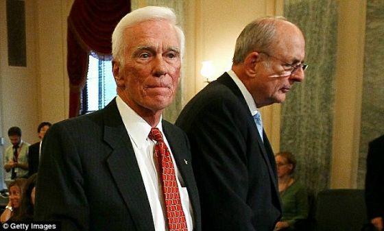 照片显示,阿波罗17号指挥官塞尔南(左)站在美国人类太空飞行计划评审委员会主席诺尔曼-奥古斯汀旁边。现在,塞尔南说他后悔把相机留在月球上。