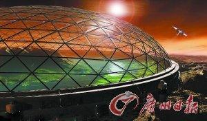 人类在火星上的住处,一个密封透明的穹顶形大型增压建筑。(虚拟图)