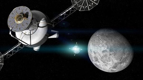 美国宇航局计划在地-月L2上建立空间站。图为登月舱脱离空间站正准备登陆月球(艺术想象图)