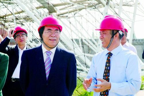 洪晓瑜(右)向白春礼汇报65米望远镜建设情况。
