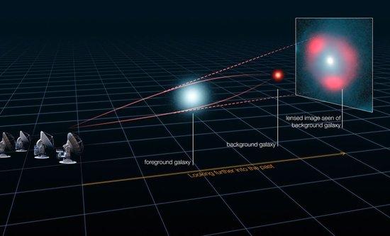 ALMA望远镜阵使用引力透镜观测的工作原理,从某种程度上看,该望远镜如同一台时间机器,观测到了过去发生的事件