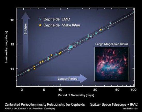斯皮策红外空间望远镜对造父变星周光关系的调查,可计算出宇宙大小、年龄和膨胀速率