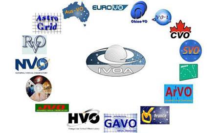 上图是由IVOA和16个成员项目图标组成的IVOA大家庭。从0点位置顺时针方向依次是欧洲、中国、印度、加拿大、西班牙、 意大利、亚美尼亚、法国、德国、匈牙利、日本、韩国、美国、俄罗斯、英国、澳大利亚虚拟天文台项目的图标。中间是国际虚拟天文台联盟的标志。