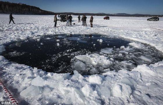 专家们表示陨石在车里雅宾斯克郊外的冰封湖形成一个直径50英尺(约合15米)的大洞。这颗陨石的重量在10万公吨左右,直径55英尺(约合16米)