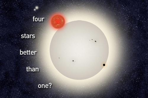 2012年最新观测到几个双恒星系统,而最令天文爱好者感到惊奇的是这个恒星系统——巨大的气态行星PH1环绕一对恒星运行,而这两颗恒星又是四星系统中的一部分,迄今为止这是天文学家首次观测到这样的恒星系统。