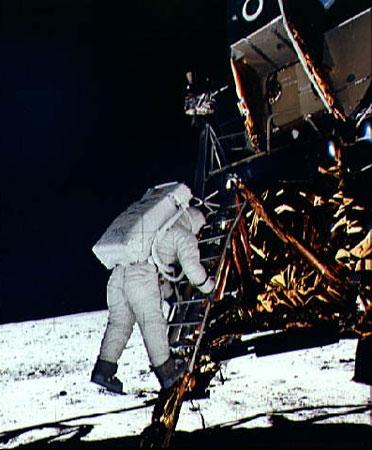 这张由阿姆斯特朗拍摄的照片中,奥尔德林正爬下悬梯准备月面行走