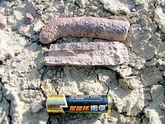 甘肃一个古湖盆地中,锈迹斑斑的“铁管”俯拾皆是。(图中电池为比照物)