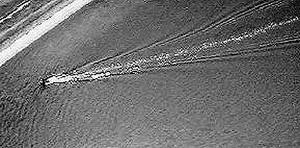 在孙兆平公布的这段录像中,记者看到,随着周围游客大叫“天池怪兽”,画面全部便从人转向天池,刚才还平静的水面上,一个黑影象快艇一样游动,身后留下的一道长长的水波纹。