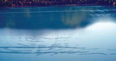 2005年6月8日在新疆喀纳斯湖拍摄的“湖怪”踪迹。6月7日19时50分左右,在喀纳斯湖景区观光的7名北京游客乘坐游艇行至三道湾附近停船拍照的时候,突然发现离游船200米左右的水面激起1米多高的浪花,两个不明黑色大物跃出水面,一前一后,鱼跃前行,湖面留下如快艇行驶过的水线,约两分钟后消失。新华社发
