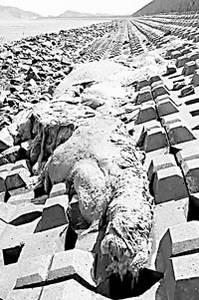 为一睹“怪物”的真面貌,昨天早上,记者特意赶往刘先生所说的洋沙山昆亭永年塘,只见“怪物”横“躺”在海塘防洪堤上,整体呈三角状,黑黝黝的一大团,散发着阵阵腐臭味。