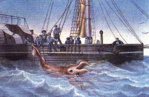 画家描绘的大海蛇袭击船只的画面 1915年7月30日,德国潜艇Y-28号在爱尔兰海岸击沉一艘英国轮船。当潜艇在水面上轰击时,从海里跃出一条奇怪的巨大的“鳄鱼”,一连出没几次,然后消失在海里,这不速之客使在场的德国水兵惊骇不已。