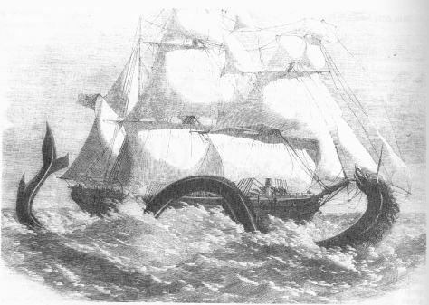 水怪图 1848年8月6日,距非洲南端500公里海面,英国巡洋舰“达达露斯”号遇到一个怪兽,脑袋有2米长,像海龟头,脖字呈墨蓝色,身体灰色,脖颈以下部分长着马鬃状东西,露出水面的身躯长达18米。一个月后,美国“达普内”号帆船也在这里遇到一个蛇身龟头怪物,身长达30米,眼睛发光。哈德逊船长命令向它开枪,那怪物似乎已感到有生命危险,在开枪的一刹那钻入水中逃走了。