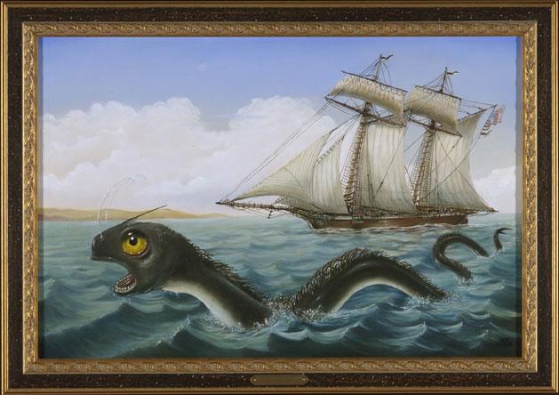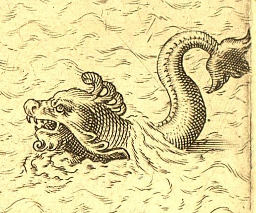 水怪图 1817年8月,300余人在美国马萨诸塞州一海港看到一个“蛇怪”,脑袋像乌龟头,身长40米,有啤酒桶一半粗,混身呈暗褐色。后来,几名工人乘小艇在海上垂钓时,再次见到这个怪物,其中一个工人掏出手枪,在离怪物20米处开枪,击中它的脑袋,随后这怪物隐入海中不见了。