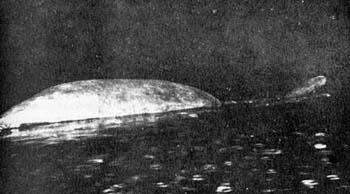 水怪照片 1917年9月,距冰岛海岸东南70海里,一艘辅助巡洋舰几乎与一个庞然大物相撞。这个怪物浑身黑色,体长18米,大大的脑袋像牛头,但无耳朵和角,额头上饰有白色条纹,它的鳍超过10厘米,又薄又钝,像块三角板。脖子长6米,活动起来像条蛇,一旦转过去,颈部就变成了一个半圆形。