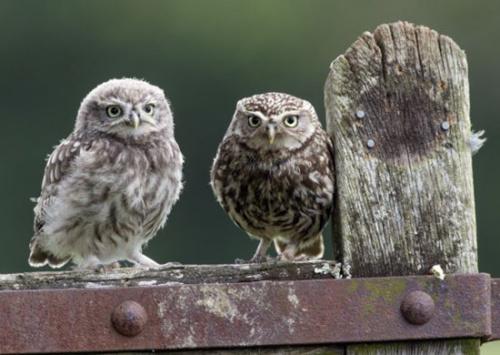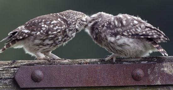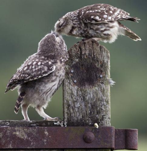 在英国伍斯特郡,两只小猫头鹰被拍到看似在亲吻,而实际上它们是在共享晚餐。猫头鹰妈妈刚从外面捕食归来,给正在年幼的孩子喂食。摄影师说,这种小猫头鹰个头矮小,所以妈妈与孩子长得十分相似,但通常孩子的羽毛更轻盈、柔软。