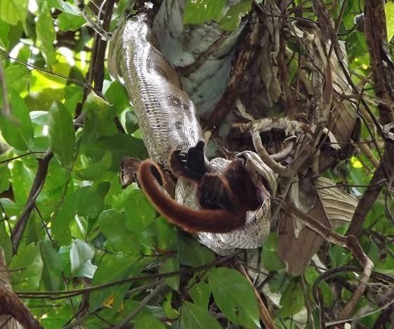 一条蟒蛇吞食一只成年雌性普鲁斯河红吼猴。一般蟒蛇只吃小型动物。