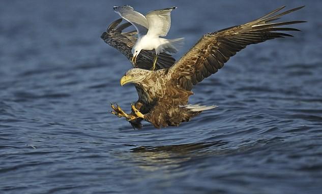 通常,跟与自己个头差不多的对手较量,才是算是公平的战斗。然而,据英国《每日邮报》9月20日报道,一只“胆大包天”的海鸥却无惧危险,挑战个头大它约两倍的白尾海雕,只因它不愿看到对手尽情独享美食。可惜,这只海鸥费尽九牛二虎之力也没能得逞,只好悻悻而归。