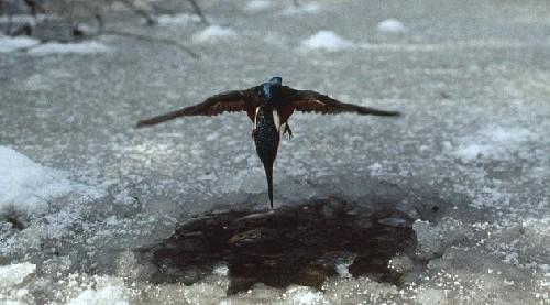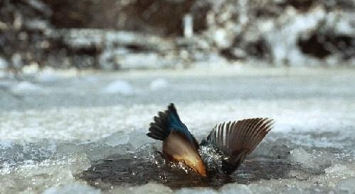翠鸟不畏严寒一头扎进冰层捕鱼