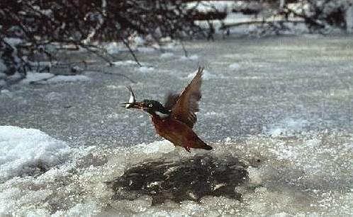 公园里的湖面早已结冰,一只聪明的翠鸟找到一个冰窟窿,在上空盘旋等待了许久,突然间一个俯冲一头扎进冰水里,几秒钟后,只见它口叼一条小鱼,得意而去。