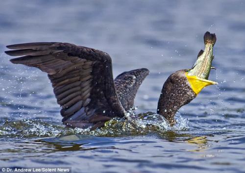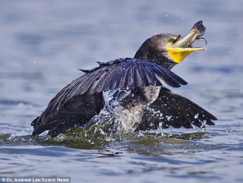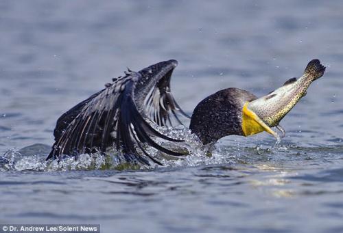 据摄影师安德鲁丠(Andrew Lee)称,他一直跟随这群鸬鹚进行拍摄,整个捕食的过程相当短,这只鸬鹚张开翅膀,溅起水花,动作敏捷,瞬间就把整条鱼吞入。