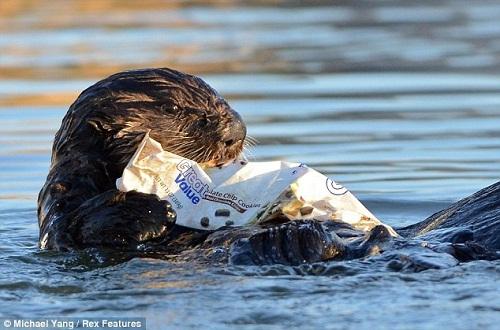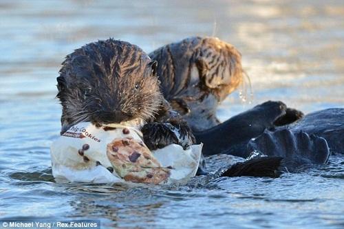 据报道,摄影师迈克尔·杨上个月在加州莫斯兰丁拍摄到了这对海獭母子。杨说:“小海獭在水面上捡到一张塑料材质的饼干包装纸。就像人类小宝宝捡到东西喜欢往嘴里放一样,这个小家伙打算把包装纸吃了。当然,这个场景对于妈妈们来说实在是太可怕了。”
