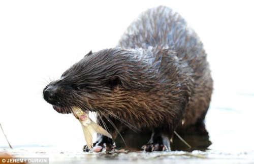 据报道,水獭跳入水中后,一会儿就抓到一条小鱼。它露出锋利的牙齿,紧紧地把鱼叼到冰冻的河岸边享用,水獭撕咬美味鱼的过程中,鱼血还溅在结冰的河岸上。