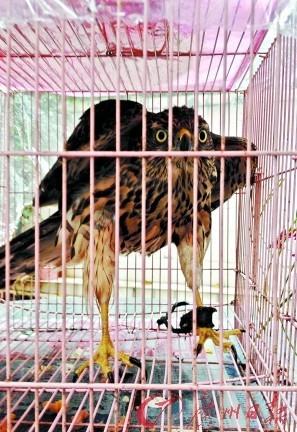 华南濒危动物研究所动物生态与恢复中心主任胡慧建根据图片判断,这是国家二级保护动物苍鹰,而且是一只曾被盗猎者抓住、自行啄开绳索逃生的野生老鹰,它的上体为褐色,眉纹不明显,腹部有黑褐色纵行点斑,属于雄性亚成体。“不知道怎么办时可以带到偏远的野外放生它,猛禽难养。”