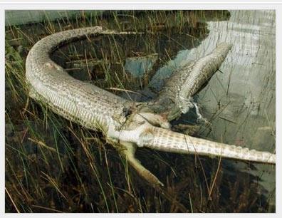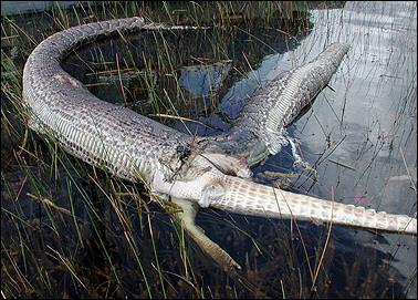 这令人震惊的一幕发生在佛罗里达州的大沼泽地国家公园。公园的生物学家斯诺透露说,不久前,在公园一个非常边远的角落里,人们意外发现了一条大蟒蛇和一条鳄鱼的尸体。