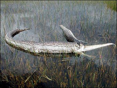 蟒蛇大约有13英尺(约合4米)长,鳄鱼也有6英尺(近2米)长,它们的尸体看起来很不同寻常,也有些可怕:蟒蛇身体中部裂开了一个大洞,鳄鱼的尾巴和两个后肢则从这个洞中伸了出来。