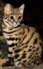 黑足猫是野生猫科动物中个头最小的种类之一,这漂亮的小东西体长不到50cm,雄性黑脚体重也才2.2公斤,而雌性只有1.5公斤注(1)。黑脚的被毛柔软而浓密,颜色从淡茶金到红棕色不等,被毛上还有深棕/黑色的条形或点状纹路点缀,而下巴、胸腹和四肢内侧则是浅色的。它的尾巴有些类似虎斑家猫那样环绕着黑色条纹,尾尖也是黑色的。需要特别指出的是它的肉垫不但也是黑色的,而且上面覆盖着黑色长毛,以防止它们在灼热的沙地上行走时被烫伤,当然它的英文学名就是根据这个富有特色的黑毛脚而来~ :)黑脚的头骨比较宽大,耳尖微圆。即便在平常的时候,这些小家伙们也常把耳朵向后背,呈“进攻”姿态,不,别以为这是因为它们脾气坏,要知道这些小家伙生活在找不到什么遮掩物的地带,捕猎的时候经常一览无余,不过把耳朵放平至少在心理上让人觉得被猎物发现的机会少了几分吧。
