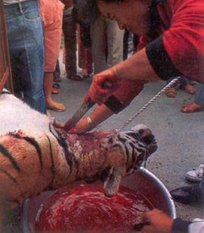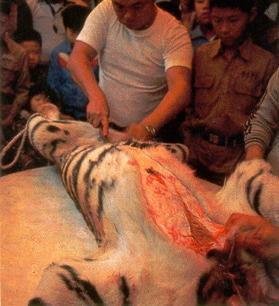 用尖刀划开老虎的腹部,开始剥取昂贵的虎皮