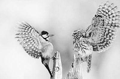 据外媒报道,35岁摄影师伊恩·斯科菲尔德在英国伍斯特郡一个自然保护区拍摄到了两只“愤怒的小鸟”间的激烈对抗。为了保护幼鸟,一只纵纹腹小鸮(俗称小猫头鹰)和一只大斑啄木鸟展开了“空中大战”。
