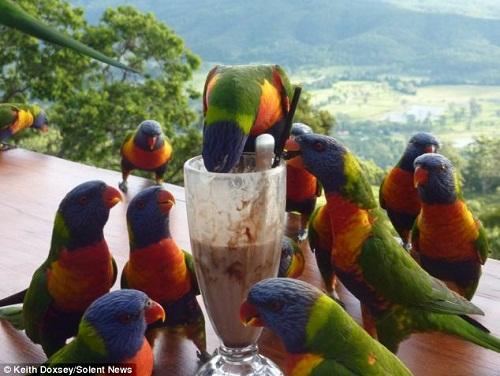 吉斯说,这群五颜六色的鹦鹉为了多喝上一口奶昔推推搡搡,甚至争斗起来。而鹦鹉们连杯底剩的一点也不放过,把头扎进杯底一饮而尽。当地咖啡馆说,他们已经习惯了这种情况,这些鹦鹉从来不怕人。