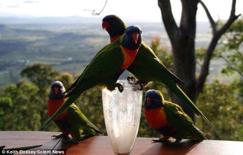 一群澳大利亚昆士兰的鹦鹉盯上了一杯奶昔,争相大啖美味。