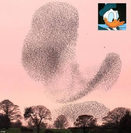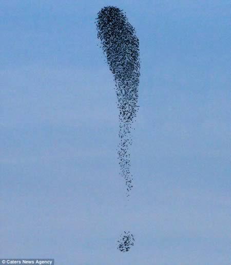 一位摄影师捕捉到5000只鸟在空中制造出一个感叹号队形的罕见瞬间。一群鸟以一种惊人方式向捕食者表示强烈抗议。当时,一个捕食者猛扑过去,想要捕获猎物,迫使这群鸟形成惊叹号的队形。摄影师纽瑞-格奴拉兰抬起头,看到这个常和震惊或惊慌有联系的熟悉的标点符号盘旋在她头顶上,顿时感到大为吃惊。于是,她立即抓起相机,拍下这群鸟在土耳其安卡拉市摩根湖上空试图拼命逃跑时形成的惊人队形。