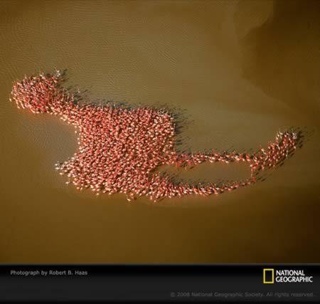 在位于墨西哥湾海岸沿线的墨西哥尤卡坦半岛,一个平静泻湖的浑水上突然出现一个由火烈鸟构成的亮粉红色鸟形。