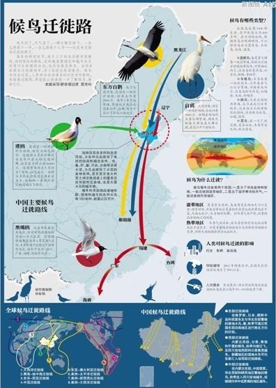每年的特定时节,成千上万的鸟沿着有规律的、相对固定的路线、定时地在繁殖区和越冬区之间进行长距离的往返,这些鸟就是候鸟。全球8条候鸟迁徙路线中,有3条经过我国境内。候鸟为何会迁徙,人类的活动对候鸟的迁徙有何影响,本报通过制图,希望能让读者进一步了解候鸟、善待它们。