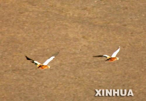 两只黄鸭在可可西里戈壁上飞翔。