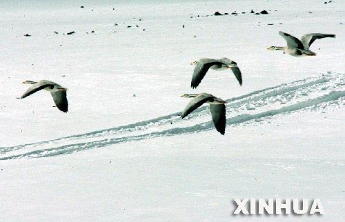四只斑头雁在可可西里雪地上飞翔