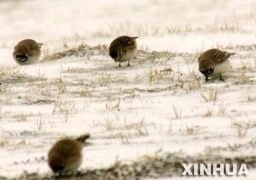 四只高原小灵雀在可可西里雪地里觅食。