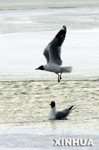 两只黑头鸥在可可西里冰湖上嬉戏。