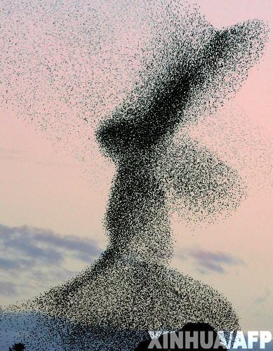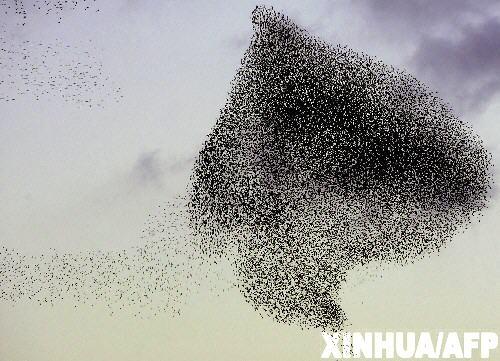 在阿尔及利亚首都阿尔及尔,一群八哥聚集在天空中。