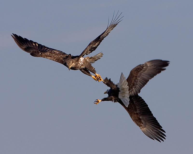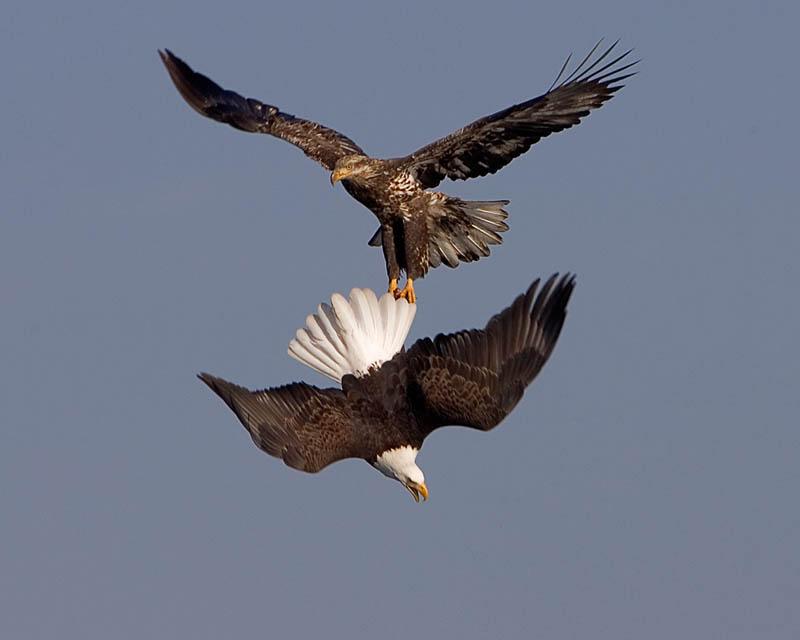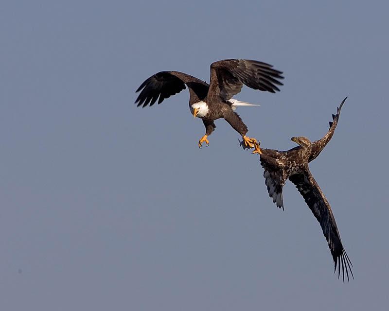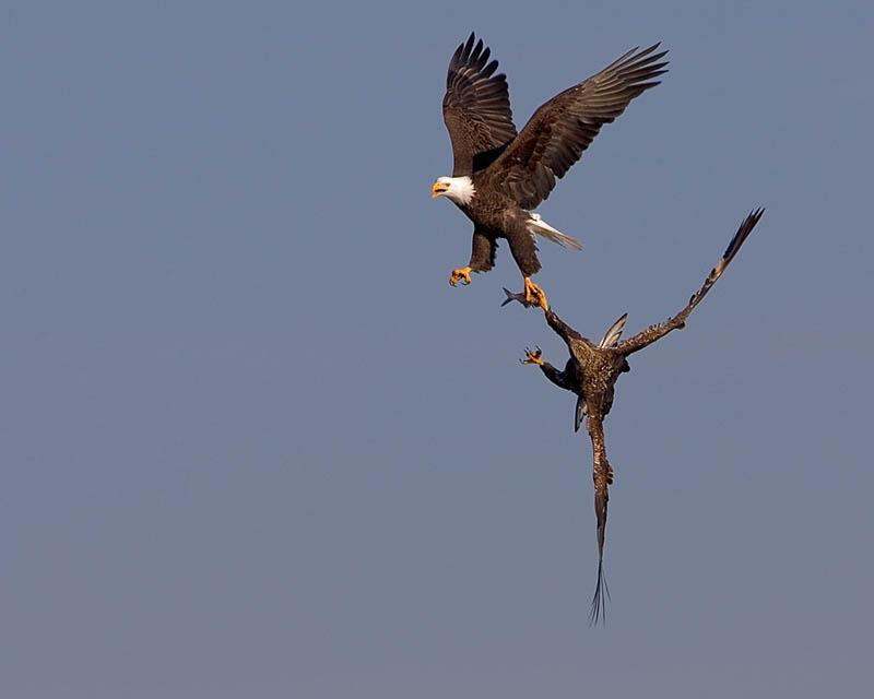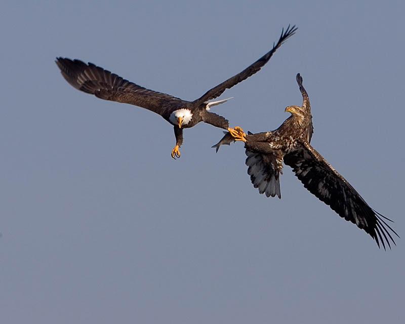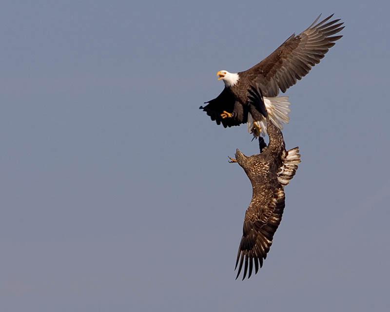 这是白头海雕与秃鹰在空中争食一条鱼的精彩瞬间