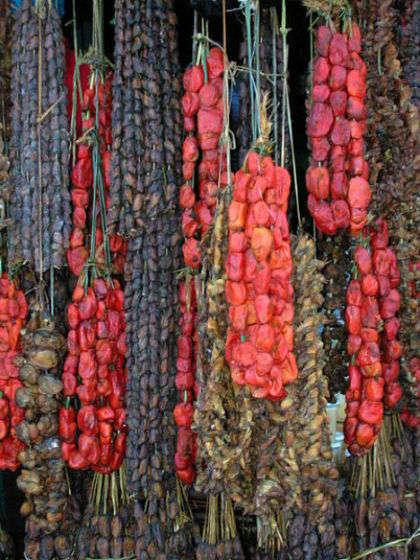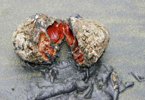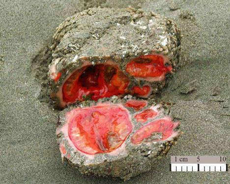 从外表上看,它不过就是一块石头,但一旦把“石头”切开,或许你就要惊讶地合不拢嘴了。这种生物学名为Pyura chilensis,属于海鞘纲腕海鞘科(Pyuridae)。它们主要生活在智利和秘鲁的近海区域,是当地人非常喜欢的海鲜。P. chilensis的肉味道有点苦,富含碘质,可生吃可炖汤,也可以切成小块挂起来风干。