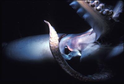 1873年,巨型乌贼在纽芬兰附近的“葡萄牙”海湾首次被发现,当时一艘小船遭到了这个大家伙的突然袭击,幸亏船主用斧头砍下了它的一根长5米、直径约0.3米的触须,才侥幸逃脱。自此后,人们就开始追踪“乌贼王”的踪迹,但令人烦恼的是,它很少在浅海露面,当它浮出水面的时候,不是已经死亡就是奄奄一息,在开展研究前就死去了。全世界至今只有250多个样本可供研究,这些样本不是残缺不全就是严重损坏。它究竟住在何处,如何生活,如何觅食和繁殖,科学文献上至今仍是空白。